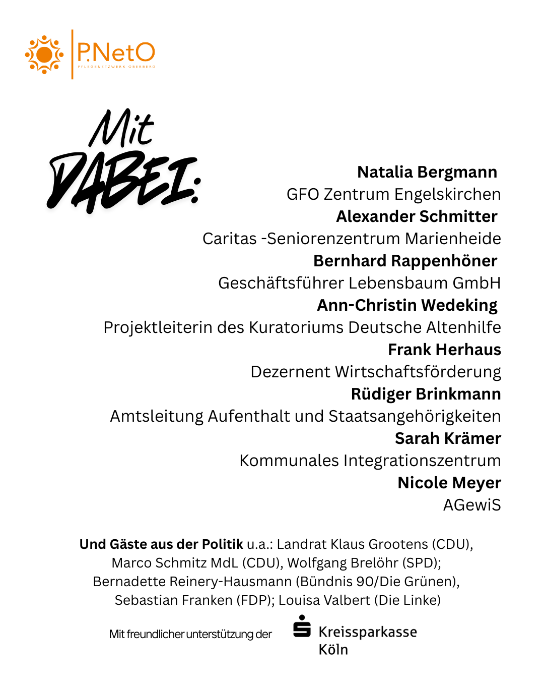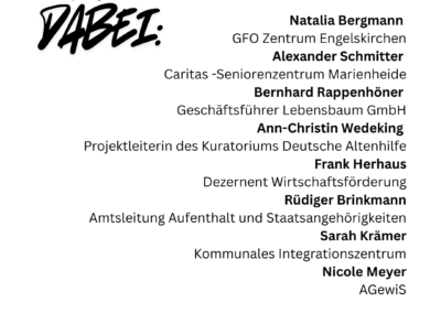 Panel-Diskussion mit Vertreterinnen und Vertretern aus Praxis, Wissenschaft und Politik: Natalia Bergmann (GFO Zentrum Engelskirchen) Alexander Schmitter (Caritas -Seniorenzentrum Marienheide) Bernhard Rappenhöner (Geschäftsführer Lebensbaum GmbH) Ann-Christin Wedeking (Projektleiterin des Kuratoriums Deutsche Altenhilfe) Frank Herhaus, Dezernent Wirtschaftsförderung Rüdiger Brinkmann, Amtsleitung Aufenthalt und Staatsangehörigkeiten Sarah Krämer, Kommunales Integrationszentrum Nicole Meyer, AGewiS Gäste aus der Politik, u.a.: Landrat Klaus Grootens, Marco Schmitz MdL (CDU), Wolfgang Brelöhr (SPD); Bernadette Reinery-Hausmann (Bündnis 90/Die Grünen), Sebastian Franken (FDP); Louisa Valbert (Die Linke) |